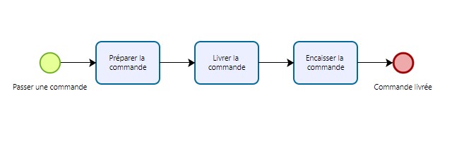- L'évènement de départ est "Passer une commande", un jeton est alors émis et absorber par la première tâche ("Préparer la commande").